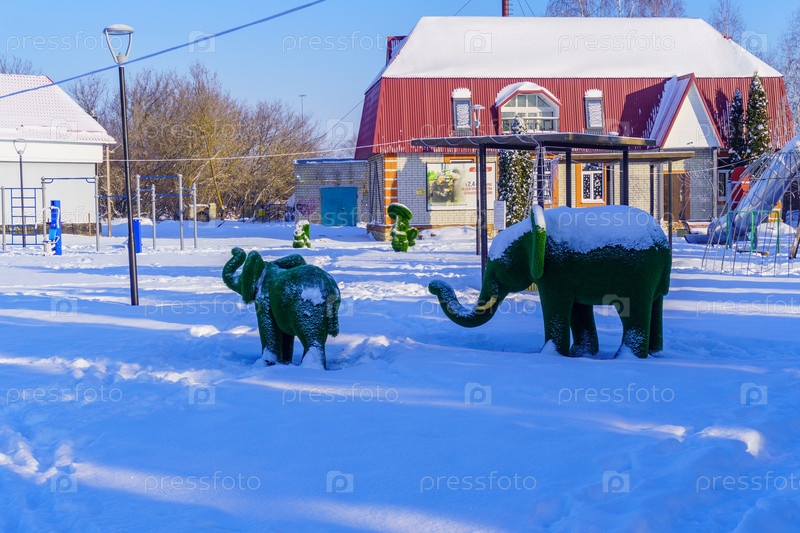 Фигурки слонов на заснеженной площади. Поселок Красная Заря, Орловская область