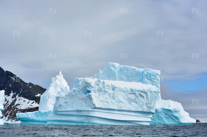 Айсберги на фоне гористого берега