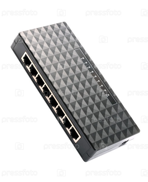 Черный 8-портный пластиковый коммутатор Ethernet изолирован на белом фоне в сухой день