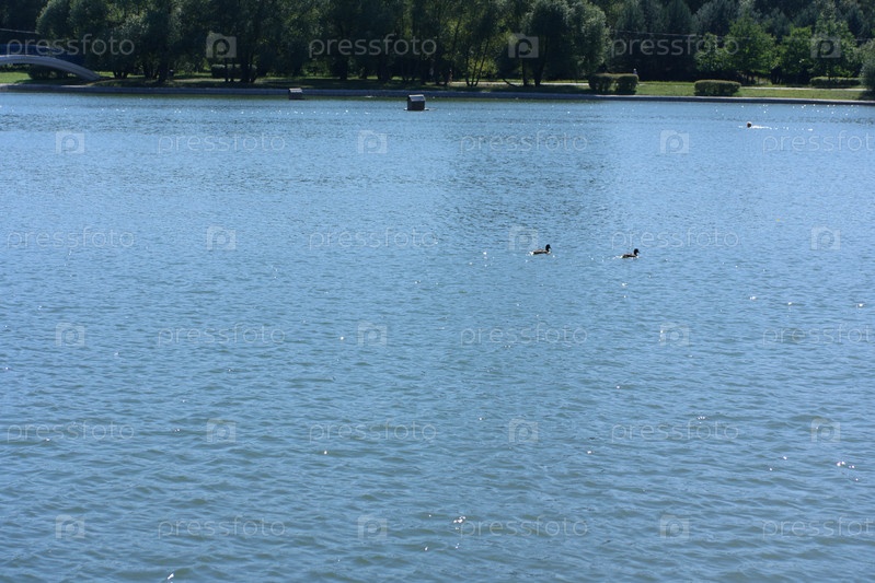 Рябь на воде в пруду городского парка в сухой солнечный летний день