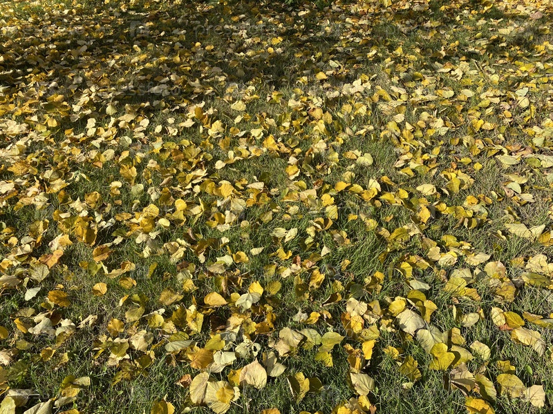 Желтые листья березы на траве в сухой солнечный осенний день