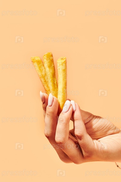 Женская рука с вкусной картошкой фри на цветном фоне