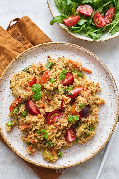 Веганский теплый салат из кускуса, помидоров, зеленой фасоли, мяты, жареной моркови и сладкого перца. Кускус с овощами в миске на светлом фоне. Вариант салата Табуле