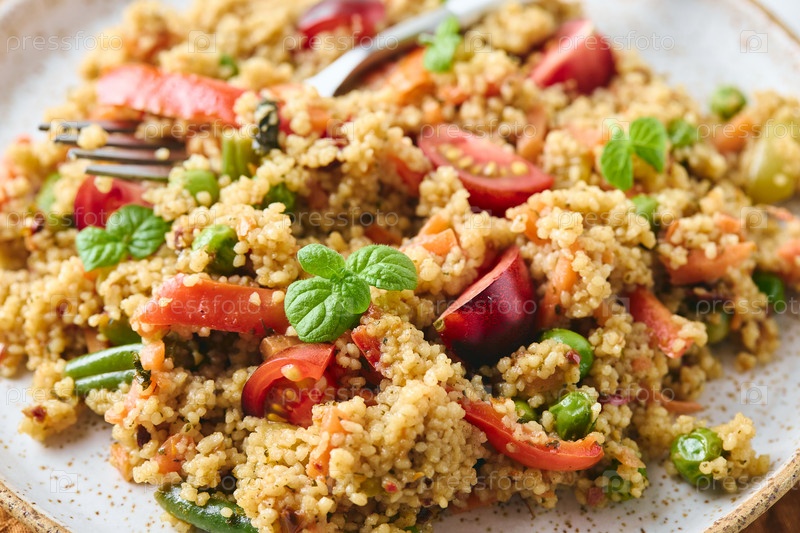 Веганский теплый салат из кускуса, помидоров, зеленой фасоли, мяты, жареной моркови и сладкого перца. Кускус с овощами, крупным планом. Вариант салата Табуле