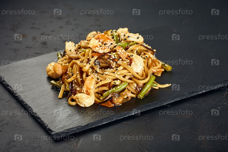 Азиатская лапша удон с креветками, зеленой фасолью и семенами кунжута на темном фоне