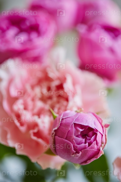 Букет из сиреневых роз и розовых гвоздик. Крупным планом