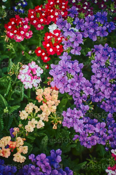 Гибридные цветы вербены цветут в парке. Крупным планом с выбранным фокусом