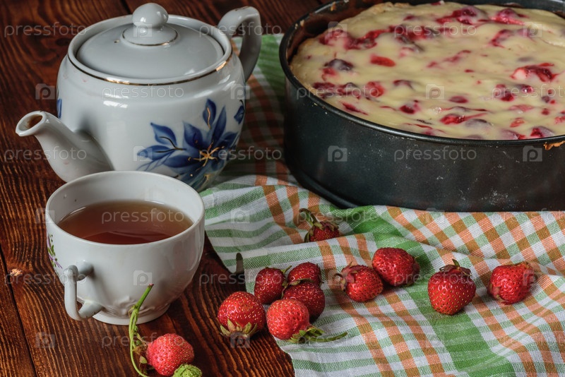 Завтрак с клубничным пирогом, черным чаем и ягодами