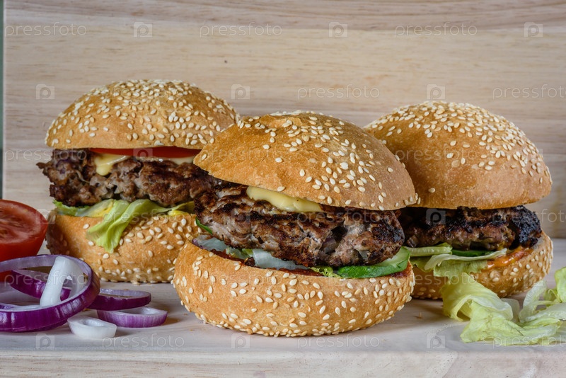 На доске лежали три свежих гамбургера