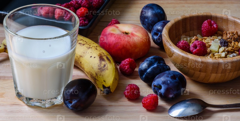 Чаша мюсли с ягодами, фруктами и молоком на завтрак