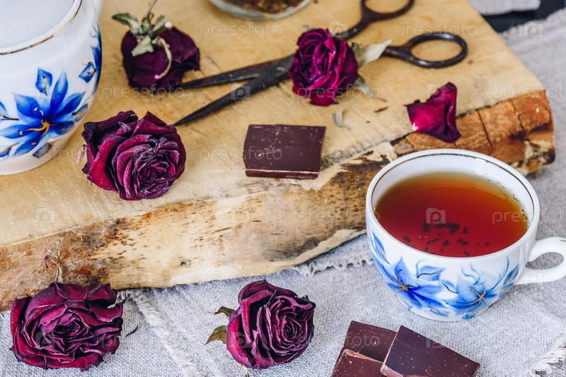 Чашка черного чая с шоколадными батончиками