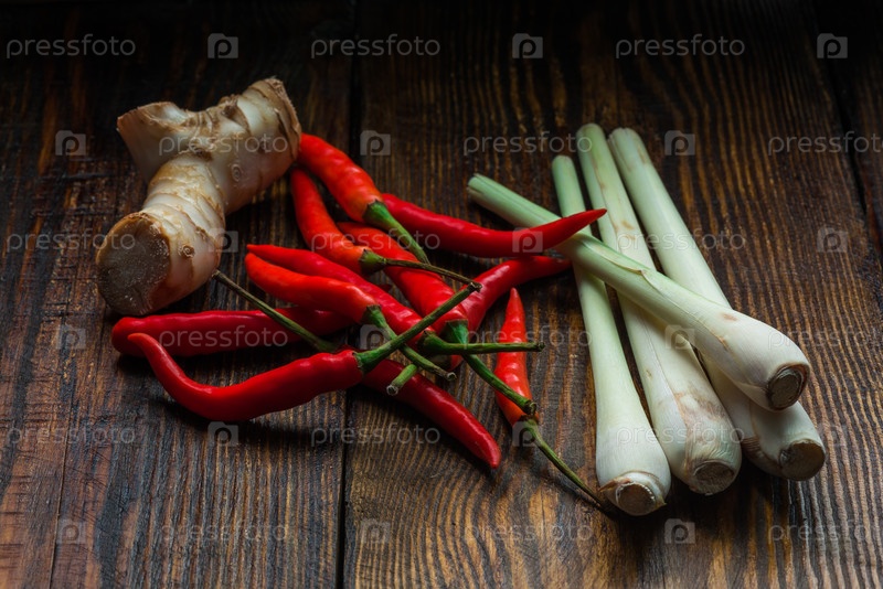 Корень галангала, мексиканский перец чили с лемонграссом на деревянном столе