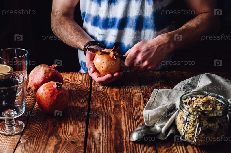 Мужчина открывает гранат ножом. Серия о приготовлении полезного десерта с гранатом, гранолой, сливками и джемом