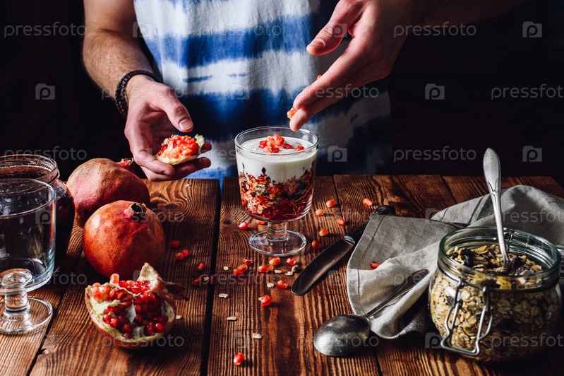 Мужчина украшает десерт зернами граната. Серия о приготовлении полезного десерта с гранатом, гранолой, сливками и джемом