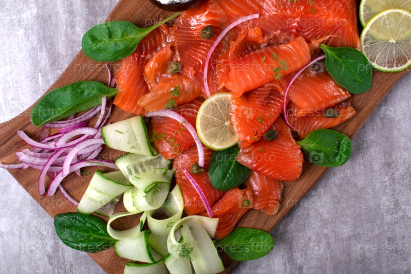 Ломтики копченого филе форели с огурцом, луком, лаймом, шпинатом и каперсами подаются на деревянной доске
