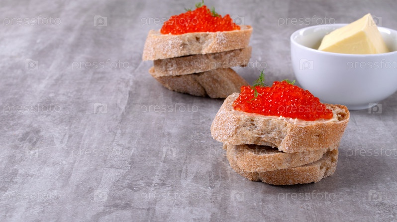Красная икра и масло на ломтике багета на сером столе. Праздничная закуска. Макет с копировальным пространством