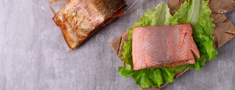 Кусок филе форели горячего копчения на листе салата на деревянной доске. Вид сверху. Копировать пространство