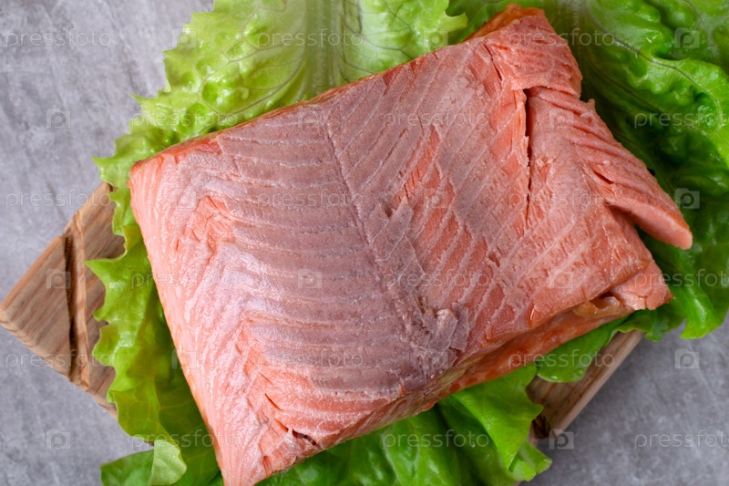 Кусок филе форели горячего копчения на листе салата. Вид сверху