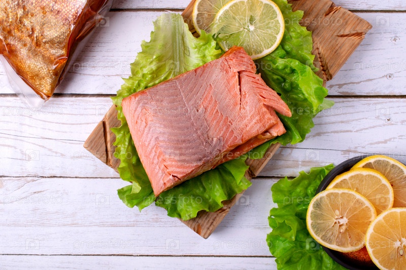 Кусок филе форели горячего копчения с листьями салата и лимоном на борту на белом деревянном столе. Вид сверху