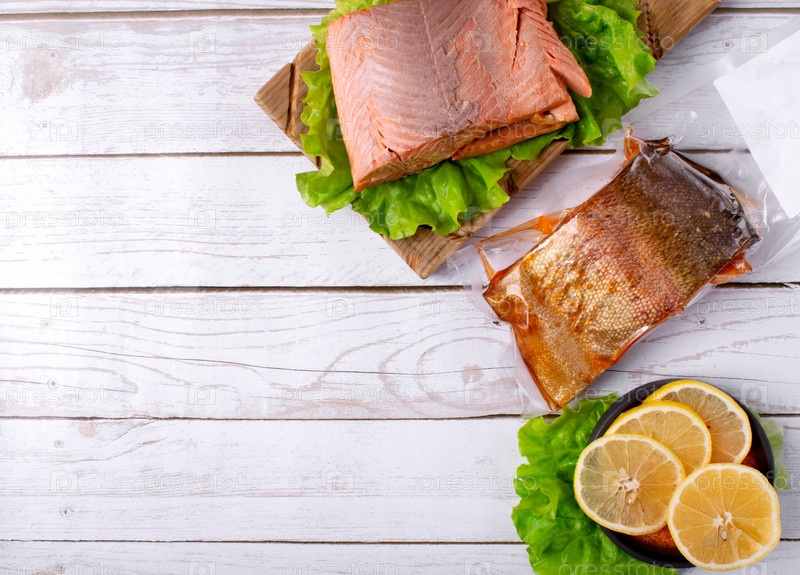 Кусок филе форели горячего копчения с листьями салата на борту на белом деревянном столе. Вид сверху. Копировать пространство