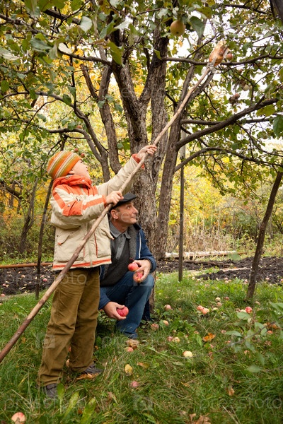 Дедушка с внуком собирают яблоки