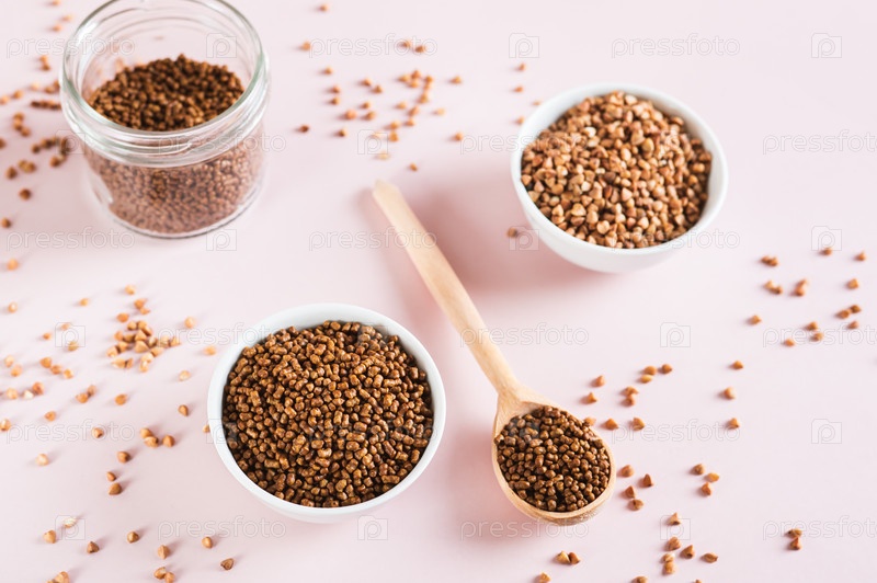 Сырой гречневый чай в миске, деревянной ложке и гречке на столе