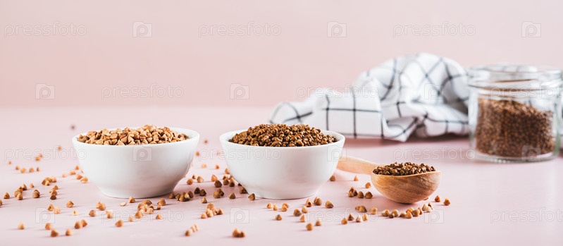 Сухие гранулы гречневого чая в миске, ложке и банке на веб-баннере стола