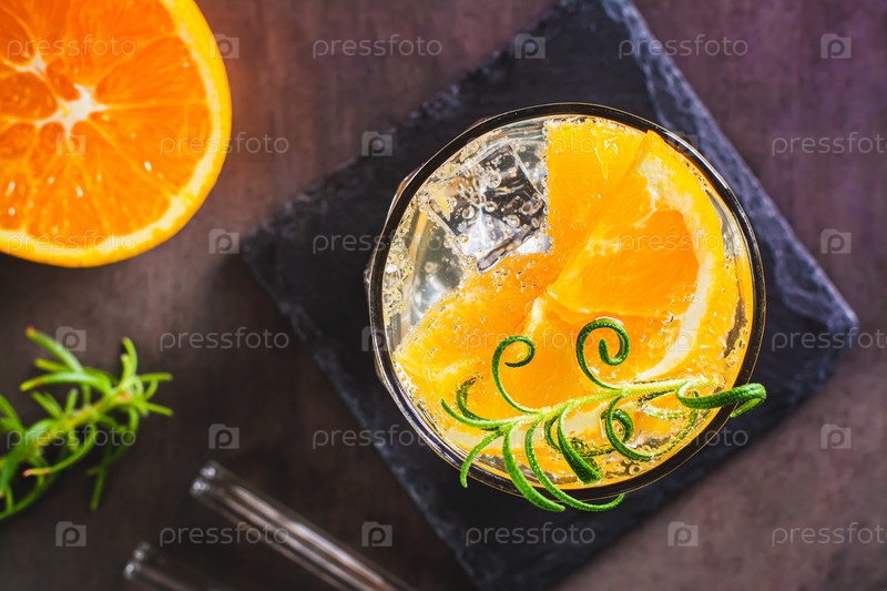 Крупный план газированного коктейля с апельсином, льдом и розмарином в стакане на столе