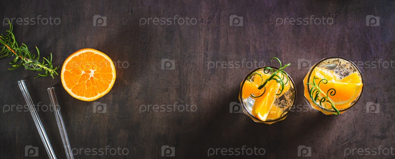 Крепкая сельтерская вода со льдом, апельсином и розмарином в стаканах на столе, вид веб-баннера