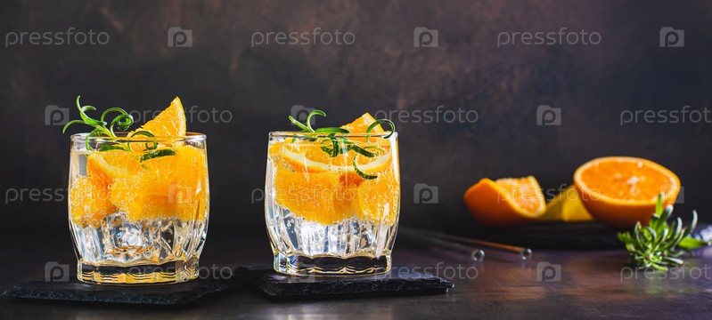 Газированный коктейль с апельсином, льдом и розмарином в веб-баннере в очках