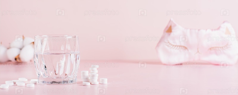 Концепция хорошего сна, снотворное, стакан воды и маска для сна на розовом веб-баннере