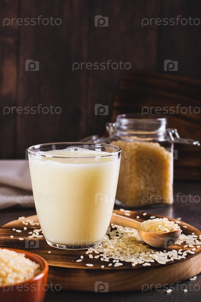 Безлактозное рисовое молоко в стакане и рисовые хлопья на столе, вертикальный вид
