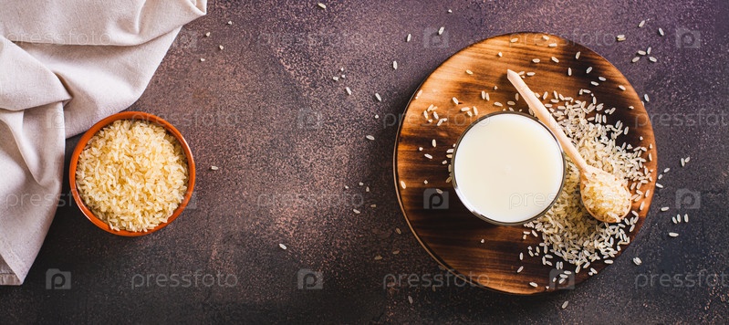 Альтернативное полезное рисовое молоко в стакане и рисовые хлопья на столе, вид веб-баннера