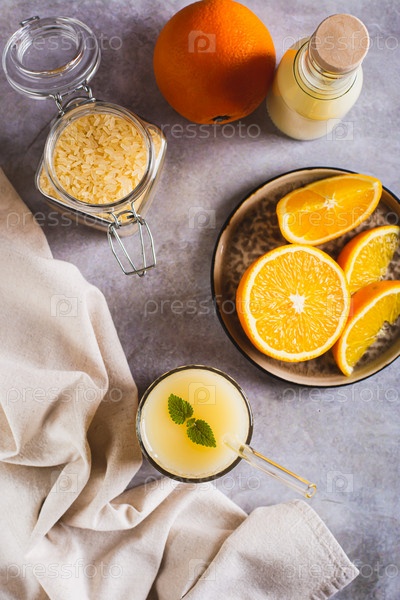 Диетический апельсиновый коктейль с рисовым молоком в стакане на столе и вертикальном виде