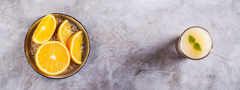 Диетический апельсиновый коктейль с рисовым молоком в стакане на столе, вид веб-баннера