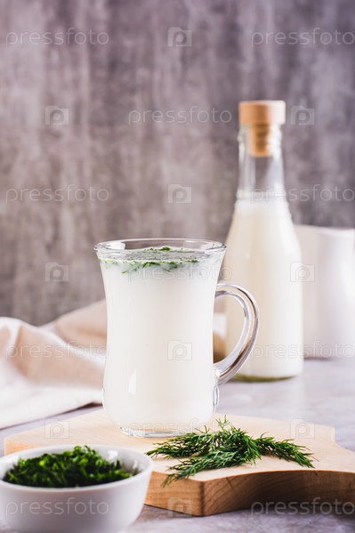 Айран домашний йогуртовый напиток с укропом в стакане на столе, вертикальный вид