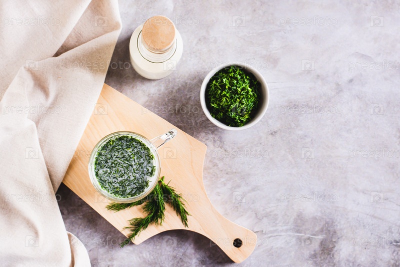 Айран домашний йогуртовый напиток с укропом в стакане на столе, вид