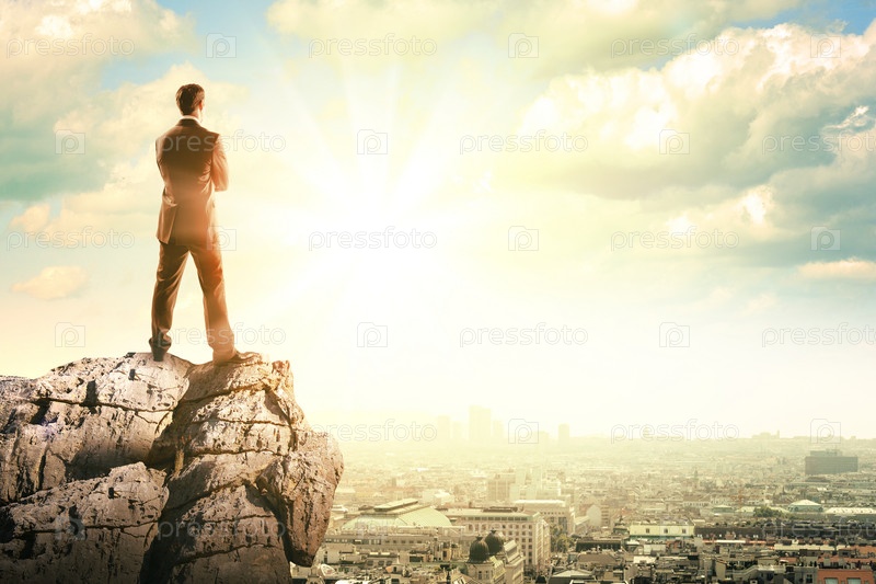 Бизнесмен с чемоданом смотрит на закат