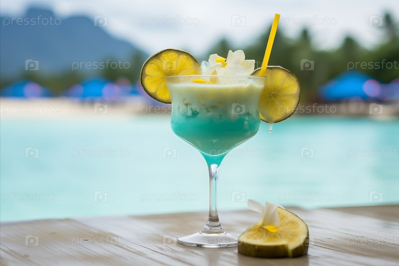 Экзотический пляжный побег. Натюрморт с коктейлем тропического острова на стойке пляжного бара