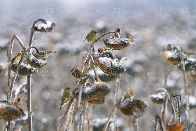Крупный план птиц, поедающих семена подсолнечника на заброшенном на зиму поле подсолнечника и покрытом снегом