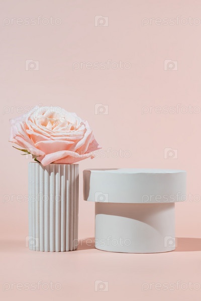 Пустые белые подиумы или пьедесталы с цветущим цветком розы для демонстрации продукции. Пустые стенды для показа или презентации продукции