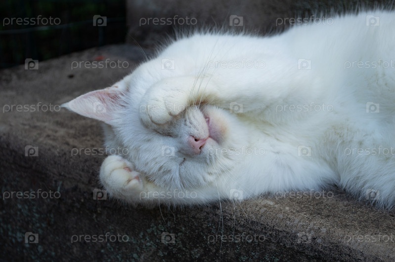 Белая кошка умывается лежа на ступеньках на улице