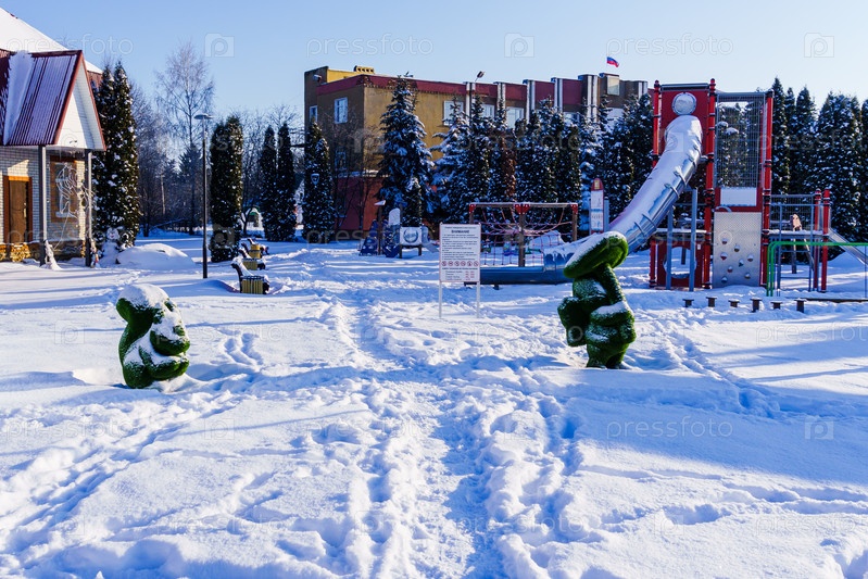 Фигурки зверей на заснеженной площади. Поселок Красная Заря, Орловская область