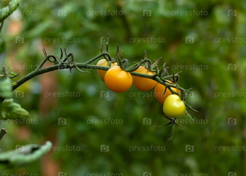 Ветка оранжевых и зеленых помидоров в теплице, на фоне зелени