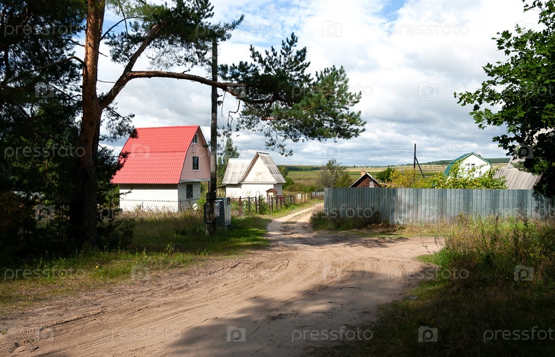 Улица деревенского села. Маленькие разноцветные домики, поля вдалеке. К деревне ведет песчаная лесная дорога. Владимирская область, Россия