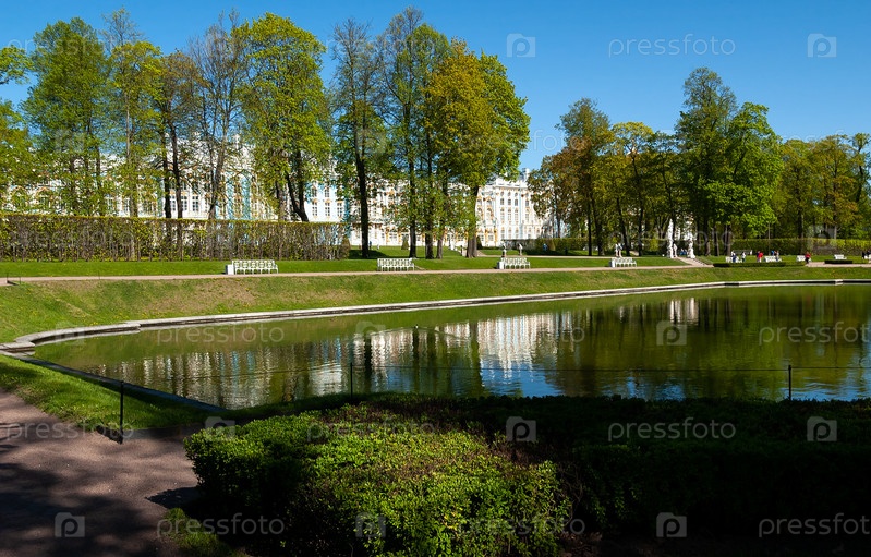 Вид на Екатерининский дворец и Лицейскую аллею со стороны Зеркального пруда. Екатерининский парк (Царское Село) 18. Россия