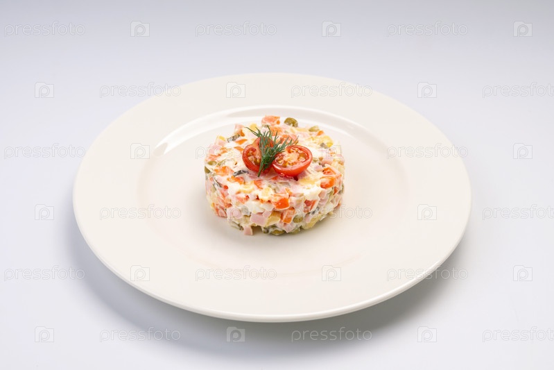 Завтрак. Традиционный русский салат на белой тарелке и белом фоне
