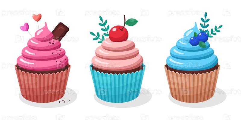 Установите кексы. Сладкий вкусный кекс, шоколадный торт, кекс. Кремовый кекс, кекс, изолированный на белом. Пекарский кекс с вишней, черникой, векторная иллюстрация кекса, концепция конфетного кекса