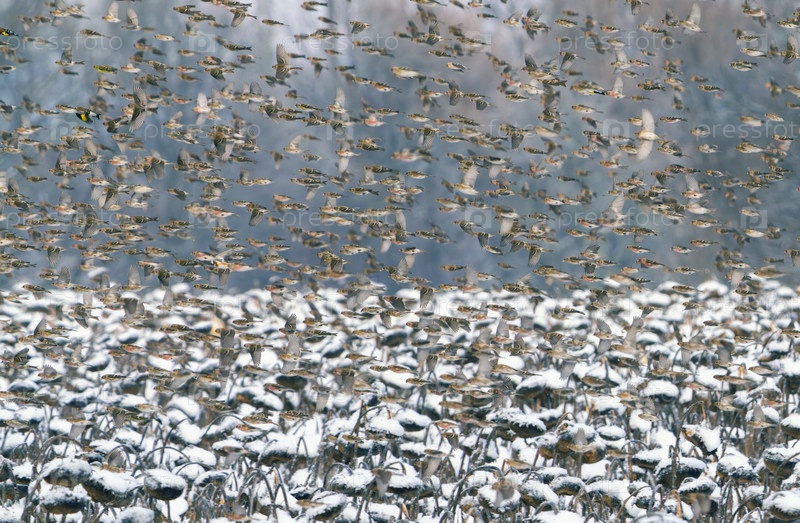 Огромные стаи птиц нападают на оставленные на зиму и засыпанные снегом поля подсолнечника