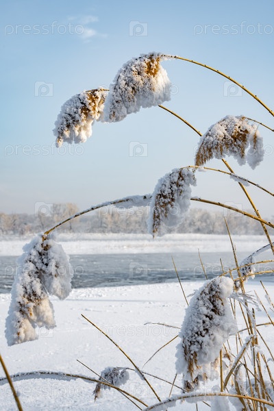 Заснеженный тростник у реки